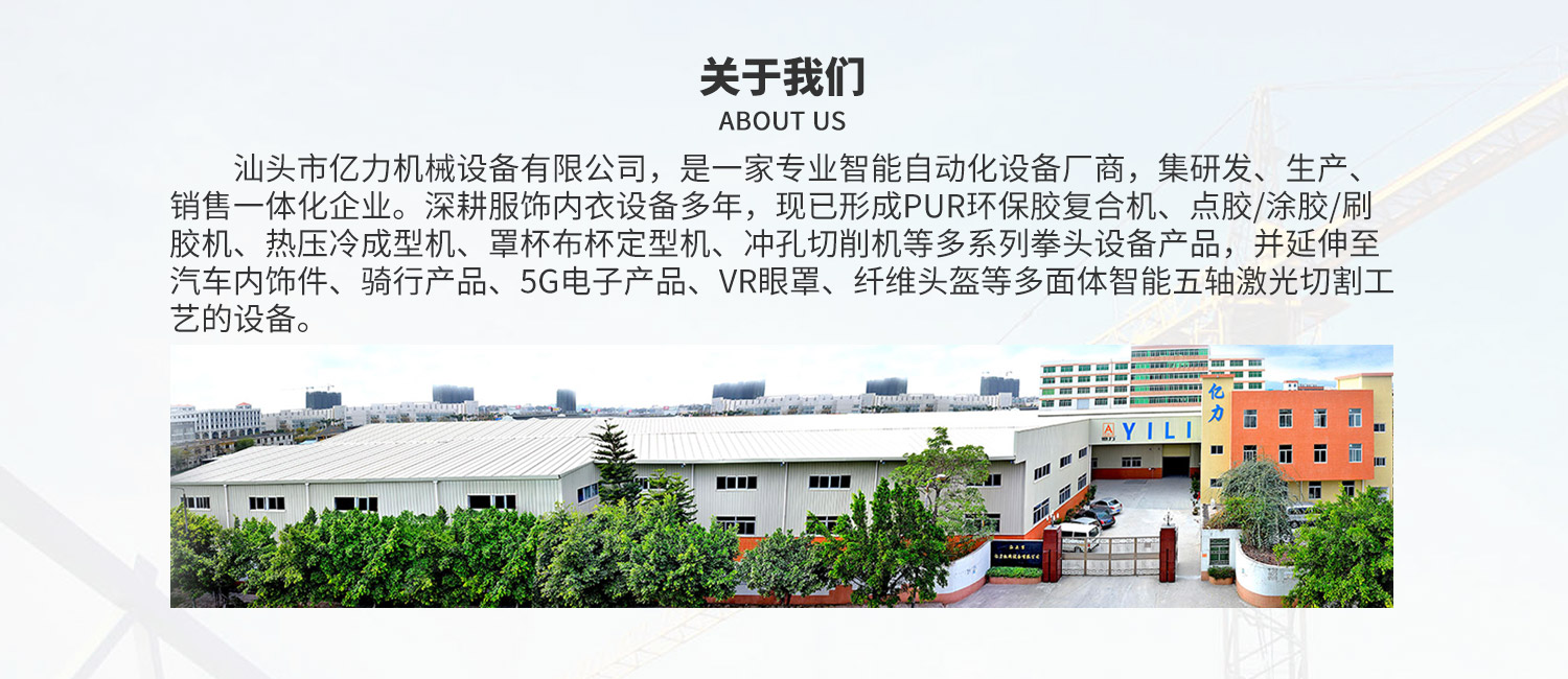 •   汕頭市億力機(jī)械設(shè)備有限公司是一家集研發(fā)、生產(chǎn)銷售于一體的專業(yè)性面料貼合機(jī)械、胸圍模杯機(jī)械、無縫工藝鞋面機(jī)械、口罩生產(chǎn)線和焊耳帶機(jī)械企業(yè)。